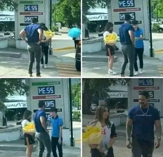 El joven llega en un motorizado y al bajarse, sostiene en una mano un ramo de rosas amarillas, y en el rostro una sonrisa nerviosa. Se acerca ella, le entrega el regalo, le da un abrazo y en cuestión de segundos se despide para volver a subir al vehículo.